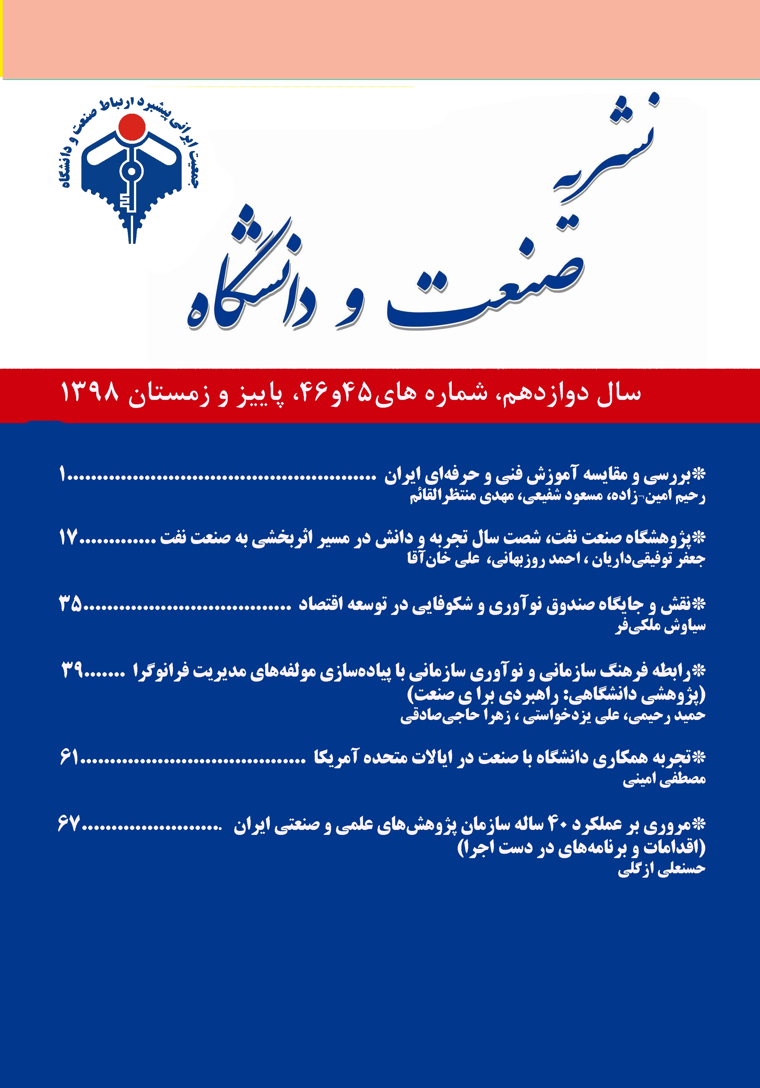 فهرست مقالات دسترسی آزاد مقاله صفحه چکیده متن کامل 1 - سازمان پژوهش های علمی و صنعتی ایران و نقش حاکمیتی آن در ارتقای زیست بوم فناوری کشور حسنعلی ازگلی دسترسی آزاد مقاله صفحه چکیده متن کامل 2 - بررسی و مقایسه آموزش فنی و حرفه ای ایران با سایر کشورهای دنیا مسعود شفیعی رحیم امین زاده مهدی منتظرالقائم دسترسی آزاد مقاله صفحه چکیده متن کامل 3 - پژوهشگاه صنعت نفت، شصت سال تجربه و دانش در مسیر اثربخشی به صنعت نفت جعفر توفیقی احمد روزبهانی علی خان آقا دسترسی آزاد مقاله صفحه چکیده متن کامل 4 - نقش و جایگاه صندوق نوآوری و شکوفایی در توسعه اقتصاد دانش بنیان سیاوش ملکی فر دسترسی آزاد مقاله صفحه چکیده متن کامل 5 - رابطه فرهنگ سازمانی و نوآوری سازمانی با پیاده¬سازی مولفه های مدیریت فرانوگرا (پژوهشی دانشگاهی: راهبردی برای صنعت) حمید رحیمی علی یزدخواستی زهرا حاجی صادقی دسترسی آزاد مقاله صفحه چکیده متن کامل 6 - تجربه همکاری دانشگاه با صنعت در ایالات متحده آمریکا مصطفی امینی