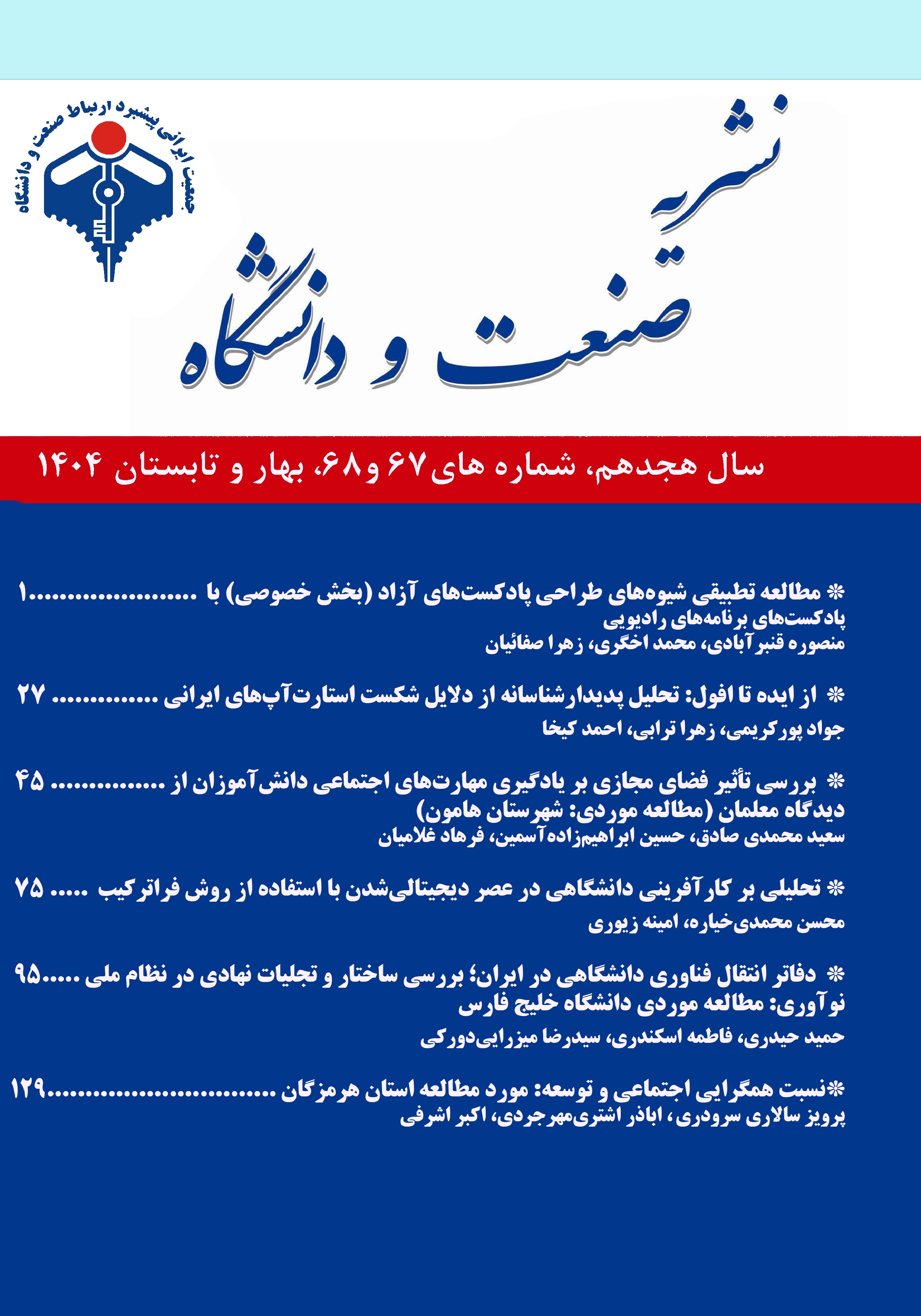 فهرست مقالات دسترسی آزاد مقاله صفحه چکیده متن کامل 1 - مطالعه تطبیقی شیوه های طراحی پادکست های آزاد (بخش خصوصی) با پادکست های برنامه های رادیویی منصوره قنبرآبادی محمد اخگری زهرا صفاییان دسترسی آزاد مقاله صفحه چکیده متن کامل 2 - از ایده تا افول: تحلیل پدیدارشناسانه از دلایل شکست استارتآپهای ایرانی جواد پورکریمی زهرا ترابی احمد کیخا دسترسی آزاد مقاله صفحه چکیده متن کامل 3 - بررسی تأثیر فضای مجازی بر یادگیری مهارت های اجتماعی دانش آموزان از دیدگاه معلمان (مطالعه موردی: شهرستان هامون) سعید محمدی صادق حسین ابراهیم زاده آسمین فرهاد غلامیان دسترسی آزاد مقاله صفحه چکیده متن کامل 4 - تحلیلی بر کارآفرینی دانشگاهی در عصر دیجیتالی شدن با استفاده از روش فراترکیب محسن محمدی خیاره امینه زیوری دسترسی آزاد مقاله صفحه چکیده متن کامل 5 - دفاتر انتقال فناوری دانشگاهی در ایران؛ بررسی ساختار و تجلیات نهادی در نظام ملی نوآوری: مطالعه موردی دانشگاه خلیج فارس حمید حیدری فاطمه اسکندری سید رضا میرزایی دورکی دسترسی آزاد مقاله صفحه چکیده متن کامل 6 - نسبت همگرایی اجتماعی و توسعه: مورد مطالعه استان هرمزگان پرویز سالاری سردری اباذر اشتری مهرجردی اکبر اشرفی